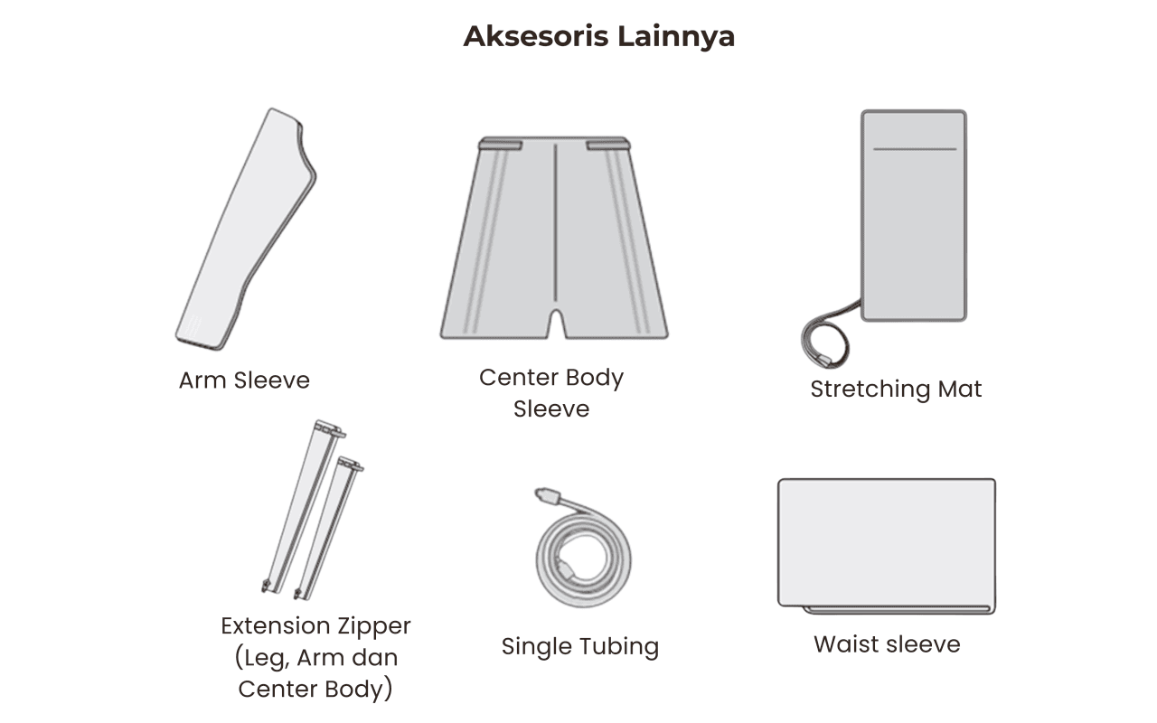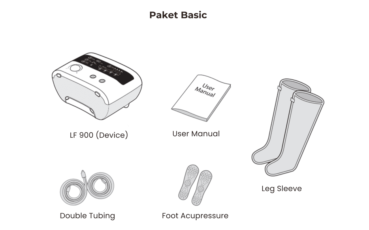 LF-900 dilengkapi 4 jenis sleeve: leg, arm, waist, dan body center. Dapatkan paket basic dan tambahkan aksesori sesuai kebutuhan! Sleeve dan tubing bersifat sekali pakai dan sebaiknya rutin diganti demi kenyamanan dan hasil optimal.