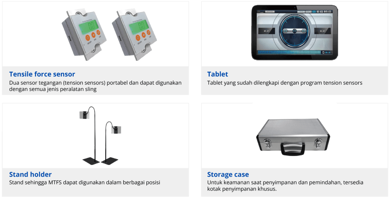 Movement Tensile Force System (MTFS) adalah alat bantu latihan yang dirancang untuk membantu orang melakukan latihan rehabilitasi dan penguatan otot sendiri dengan lebih efektif. Alat ini terdiri dari sensor yang mengukur gaya tarikan, sebuah tablet untuk menampilkan data, serta dilengkapi stand holder yang mendukung penggunaannya dalam berbagai posisi. MTFS mudah dibawa ke mana-mana karena dilengkapi dengan kotak khusus, dan bisa digunakan untuk berbagai jenis latihan sesuai kebutuhan pengguna—baik untuk pemulihan cedera otot dan saraf, rehabilitasi olahraga, maupun latihan fisik untuk orang lanjut usia. Selain itu, MTFS bisa digunakan bersama dengan produk lain dari Marpe untuk hasil yang lebih maksimal.